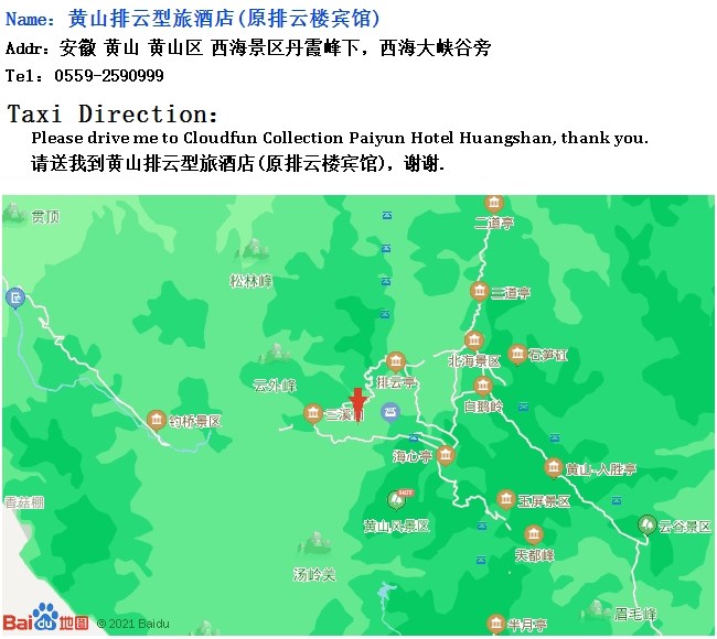 The hotel is located in Huangshan Scenic Area. Tourists who have booked a hotel on the mountain need to buy tickets at the artificial channel of the scenic area before entering Huangshan Scenic Area. Please pay attention to the opening and closing time of the scenic area and the opening time of the cable car, which usually stops at around 17 o'clock, and arrange your itinerary reasonably. There is a tourist bus to the south gate of Huangshan Scenic Area at Huangshan North Station. Vehicles are restricted from entering Huangshan Scenic Area, and you need to take the special shuttle bus in the scenic area at the transfer center of the scenic area.